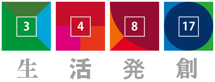 生活発創のロゴは、それぞれSDGs(2015/09国連総会にて採択された17の持続可能な開発目標)の4つの目標(№3,4,8,17)と対応しており、当法人の4つの活動領域を表しています。